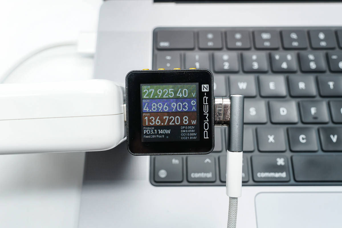 Selv... den understøtter også 140W hurtigopladning, og adapteren er tilsluttet Apples 140W galliumnitridoplader og MagSafe 3 hurtigopladningskabel. På dette tidspunkt er ladespændingen 28V, og effekten er 135,72W.
