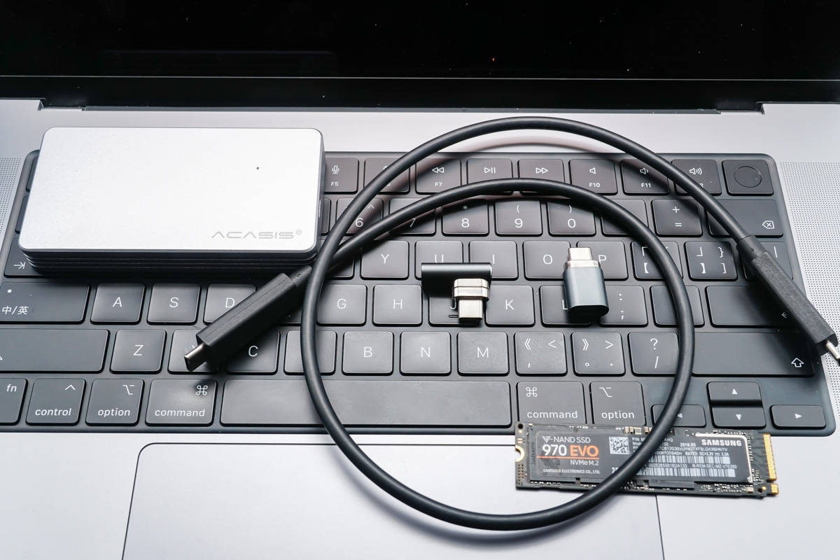 Lad os derefter tage et kig på datatransmissionstesten. De anvendte værktøjer er Samsung 970 EVO solid-state-drev, Thunderbolt 3-harddiskboks, Thunderbolt 3-datakabel og to adaptere.