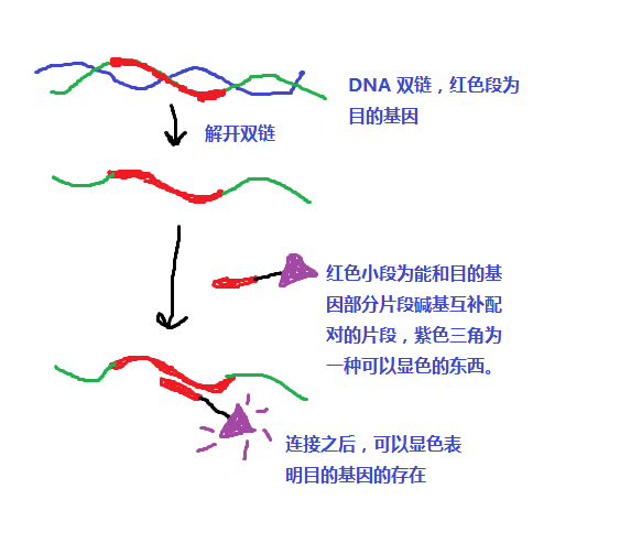 Under passende pH, temperatur og ionstyrke kan DNA-proben hydrogenbinde med det komplementære umærkede enkeltstrengede DNA eller RNA i prøven, der skal testes, ved at udnytte den høje nøjagtighed af molekylær denaturering, renaturering og basekomplementær parring. kombineres for at danne et dobbeltstrenget kompleks.